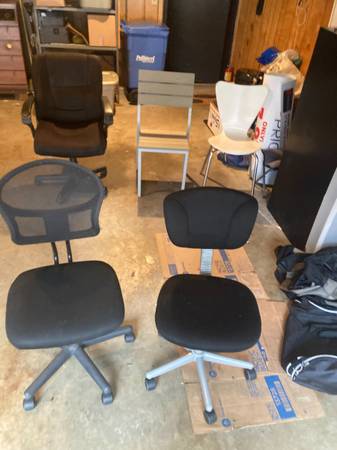 6 0ffice chairs on wheels, $7-25 each. 2 wooden chairs, $7 or $9. 1 bar chair, tall, upholstered, with backrest $30. Also 3 smaller desks, $7-25 each. To inspect call ahead, am available most times.