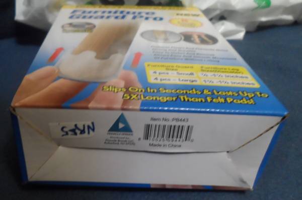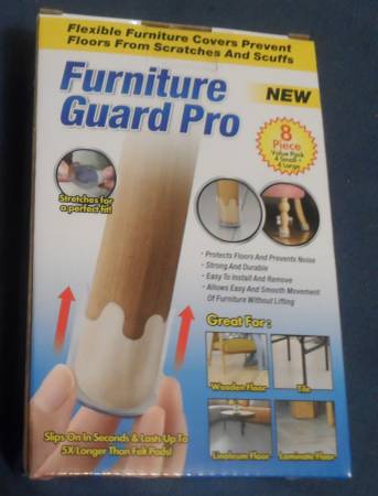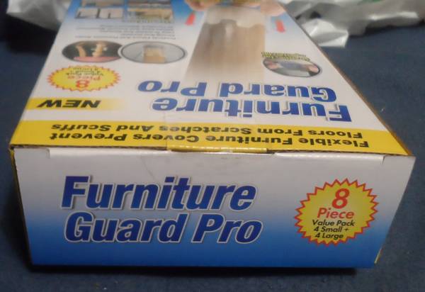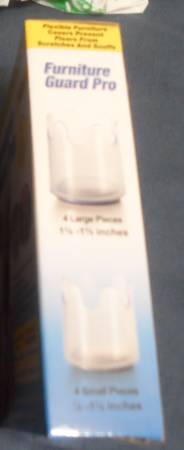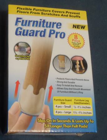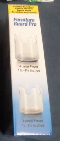 FURNITURE GUARD PRO: Flexible furniture leg covers prevent scratches and scuffs to floors. Strong, durable, flexible, and easy to put on. Allows easy and smooth movement of furniture without lifting. Lasts 5x times longer than felt pads. Four large 1-3/8” to 1-5/8” and four small 7/8” to 1-1/4” per box. Have two boxes. New unopened factory sealed boxes.