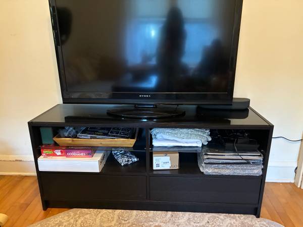 Black/brown color with smoke glass for the shelves and top. Drawers work perfectly. A few minor dings on the wood due to normal wear and tear, nothing major.
