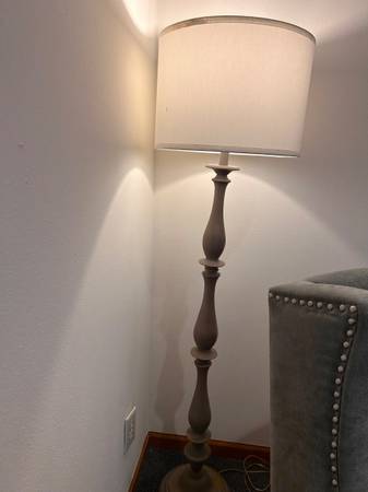 BRAND NEW! This 61" floor lamp brings traditional style and an essential boost of brightness to any room. It's made from polyresin, and it showcases a turned design with a finish that's designed to mimic the look of wood. A linen drum shade sits up top to complete the look, diffusing light from a single 100W bulb (not included) in an ambient direction in your living room or bedroom. Plus, this floor lamp features a 3-way switch to adjust the lighting throughout the day.