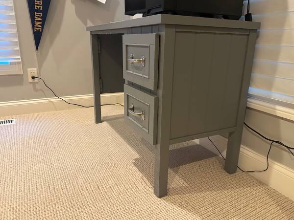 Painted grey wooden desk Top has a few chips- shown in photo 29.5” high x 20” deep x 43” wide