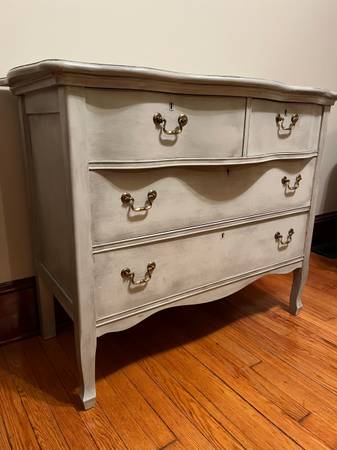 "Shabby chic"/"farmhouse chic" 4-drawer dresser. This grey dresser has been painted to look distressed (remember the 2010s? this was cool then) and has held up well in the 10 years I've had it. Comes from a smoke- and scent-free home.