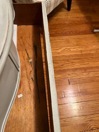 There is a decorative rail that is missing from the top and there are some areas of chipped paint on the front (both pictured). The drawers work fine, although the middle one sticks a bit and has a gap in its base (also pictured).