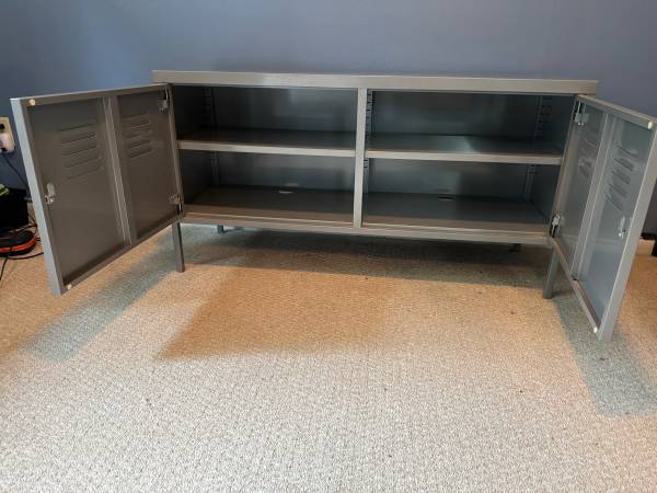 Locker room style metal media cabinet and nightstand/side table Media cabinet: 15 3/4” deep x 24 1/4” high x 46 1/2” wide Side table: 12” deep x 22 1/2” high x 15 3/4” wide