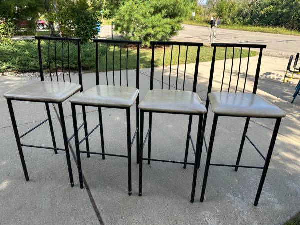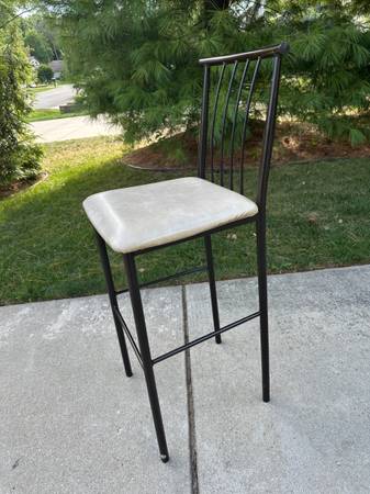 4 Bar Height Chairs $100 Color- Dark bronze with a padded seat Super comfy, very sturdy Fair condition- padded seat is worn Total Height 44" Seat 17" x 16"