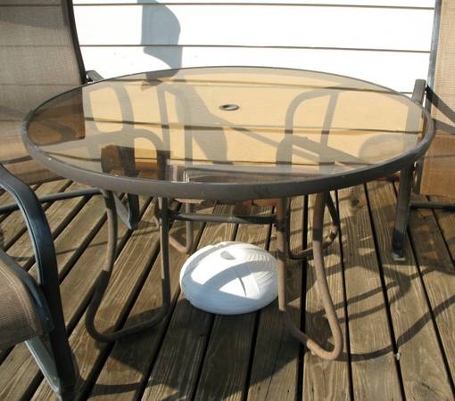 Smoked glass top patio table with steel frame and umbrella hole. 48” (4 ft.) across the top x 27” high.