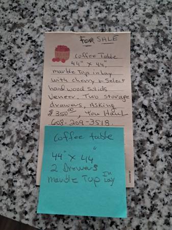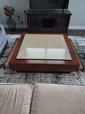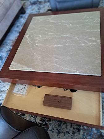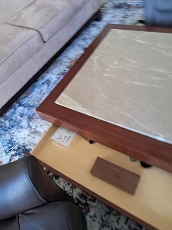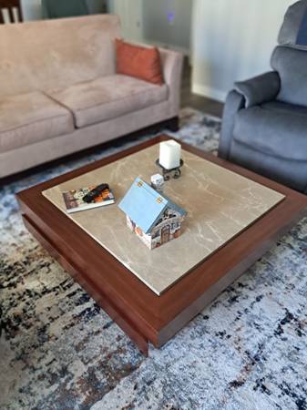 Coffee table inlay marble top, cherry wood base, 1500$ new, beautiful addition to any room. Complete description in the photo section.