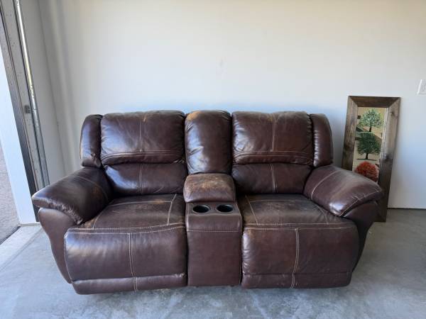Super comfy leather loveseat, reclines and can lay back too. Cupholders and remote storage. 4 season picture with mirrored back. You pick up both in Sun Prairie near Egre and Bird …. A\and they’re...