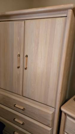 A 7 piece solid oak Wambold Fine Furniture set (excluding mattress and mattress support) for a king-sized bed. Gently used for 6 years. Includes illuminated headboard bridge, headboard vanity, side hutches, dresser, vanity for dresser (with hutches), and armoire. Numerous drawers and nooks for storage and decoration. Matching armoire provides a place for TV and video storage, as well as extra drawers.