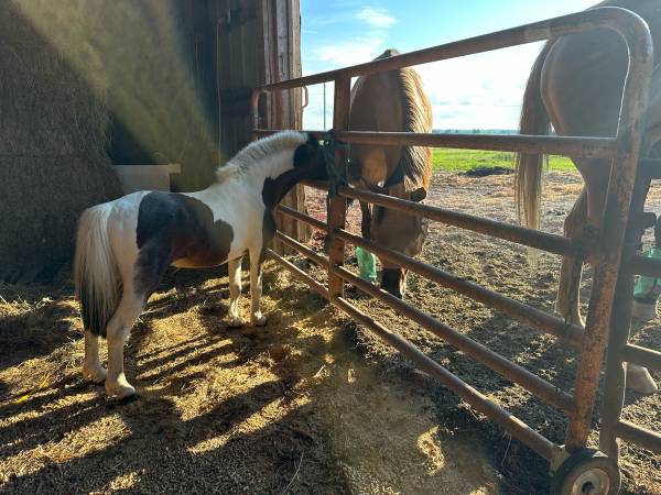 Black paint “Sirius Black” 16 years old. A little hard to catch without grain but very food motivated! Rides and drives! I have led kids around on him and he’s been great! Out with goats and my young gelding and is a complete gentleman. $1200