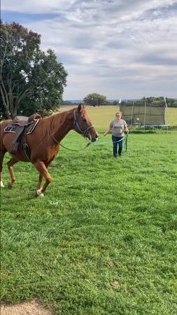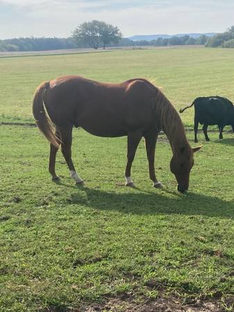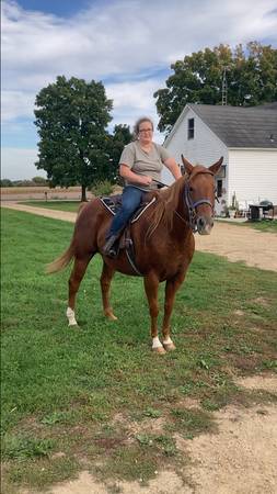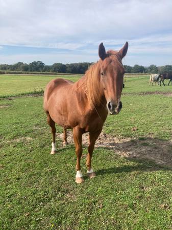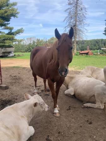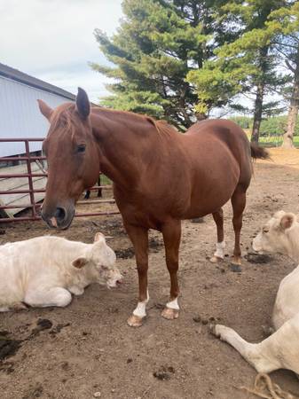 This is John. He’s a 12 year old 16h grade gelding. Broke to ride but needs a refresher. He is a very friendly and goofy guy, as you can see he likes to babysit my calves lol and is an easy keeper. Big stocky shapey horse.