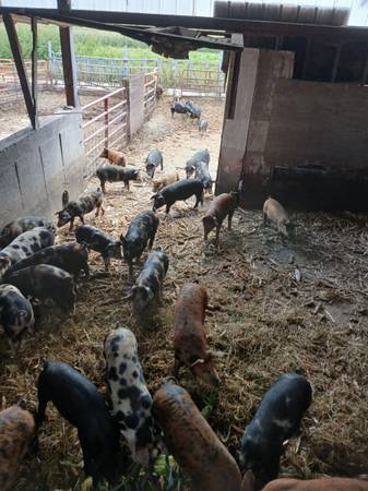 Have 40 feeder pigs older breed crosses fast growing excellent red meat do very well on pasture or woodlots most are in the 60to100 lbs range a few 30 -50 priced by size 40 available