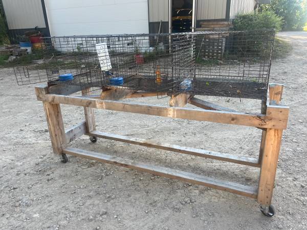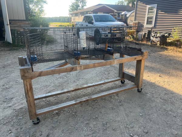 3- 24”x24”x16” cages that are mounted on a 30”x84”x30” bass with four caster wheels on it for easy moving. Also has built in slides to hold each cages tray for droppings. because of used conditions trays were just thrown, but can be purchased at tractor supply stores.
