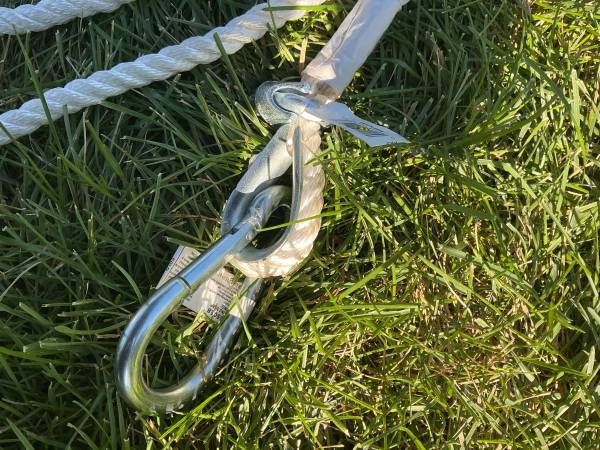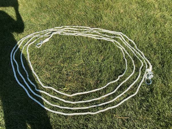 New 50’ White Nylon Rope. Has Clip on one end and Caribeners attached. Never used. Just $30.
