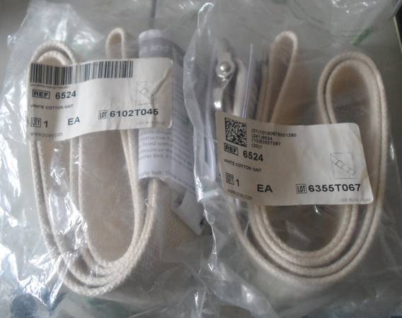 GAIT/TRANSFER BELT: A Posey Brand white cotton gait/transfer belt. Used to put on someone that is unsteady while walking giving you a safe and secure hand hold on them. Size. 2 inch wide and 48” long. Metal buckle. In new, unopened, factory sealed packages with instruction on use inside. Have two belts.