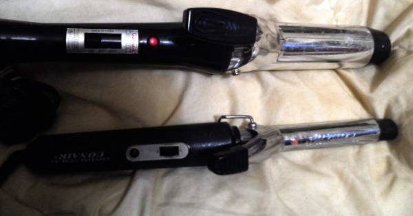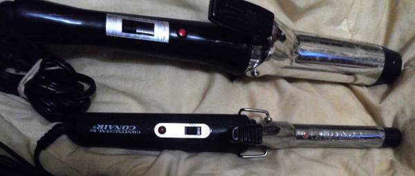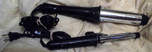 HAIR CURLING IRONS: A pair of standard 120 volt electric hair curling irons. Off/Low/High settings, a red LED “ON” indicator light, 6 foot cords. UL listed. Excellent condition.