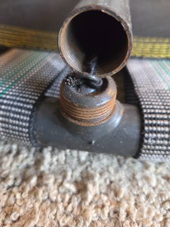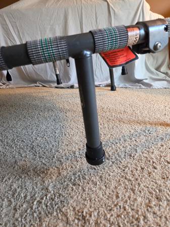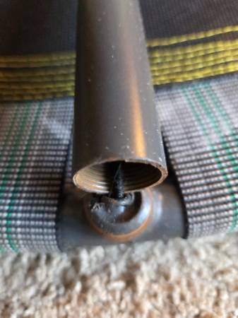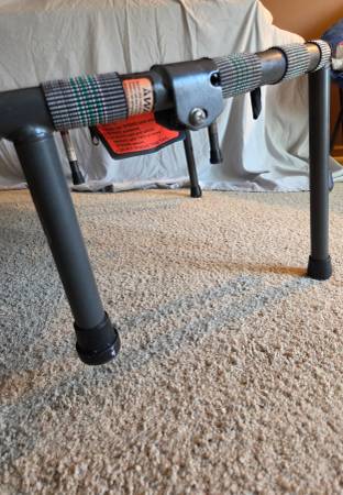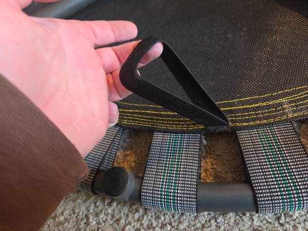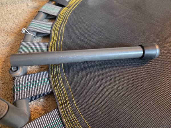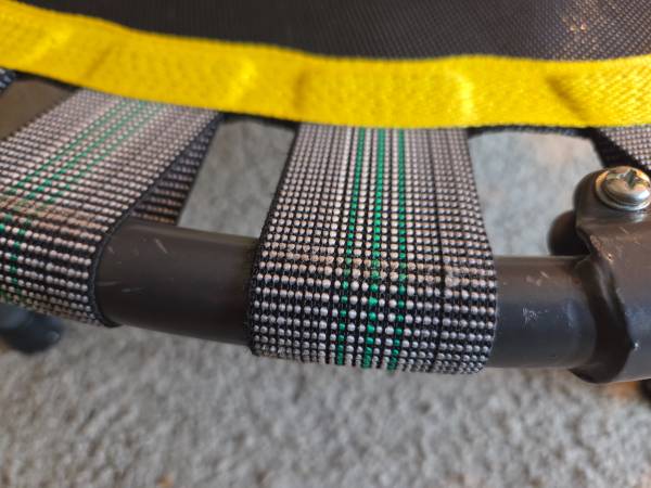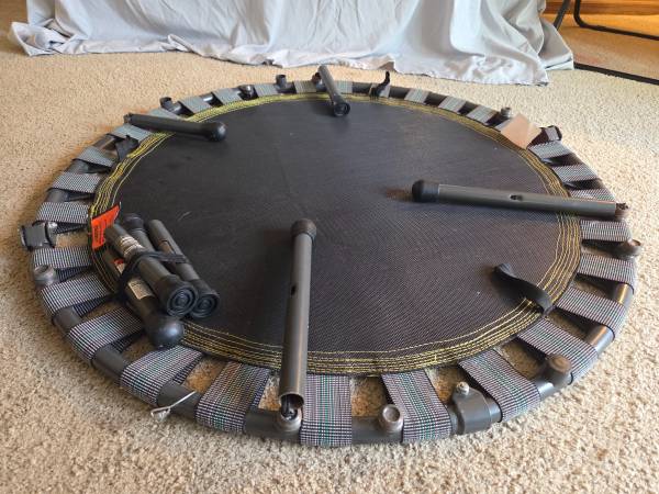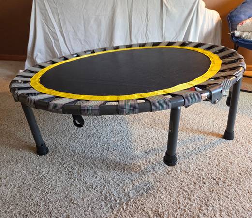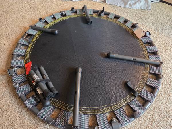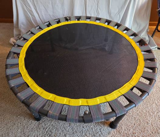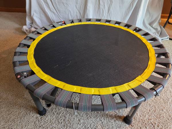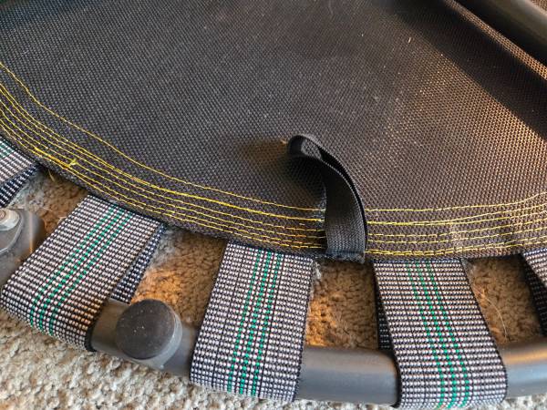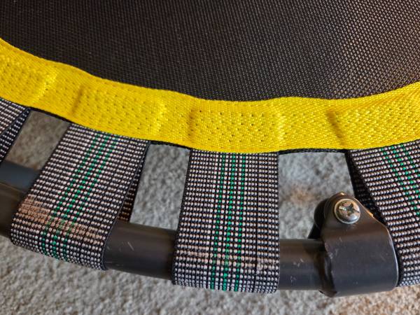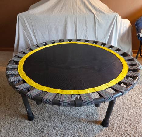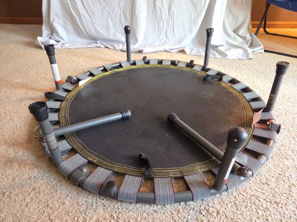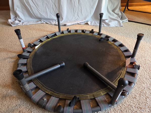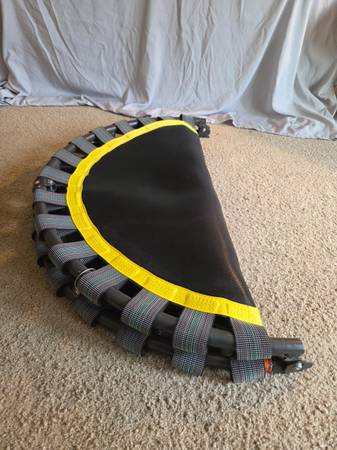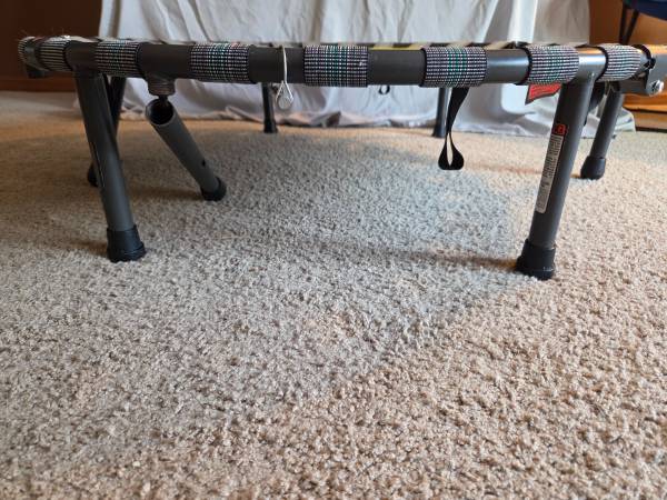 Gently used and in excellent condition. There is some small rusting on the joints of the legs and a few scuff marks, otherwise in excellent condition. It solid, secure and durable. There are 6 legs and then 2 additional long legs that can be screwed in to give it a tilt. The 2 longer legs unscrew and there is a flexible metal string that keeps them attached to the trampoline. The other 6 legs unscrew aswell with 2 being attached the same way the long ones are and the other 4 have storage bands on the underside of the trampoline. The trampoline is black with bright yellow edging and the bands attached to the metal base are gray, black, white, and green. Folds in half and in quarters for easy storage. Easy to unfold and use. It's 8.5" tall when level and 36" round. It's 13.5" tall (at tallest part) when it's tilted.