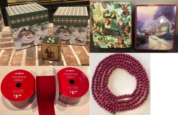Christmas Decor $5 for items in each photo - box set, tin boxes, felt ribbon, wood cranberry garland