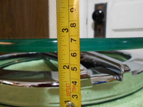 Offering a RARE Tevion 330 lb Glass & Chrome Unique Ornamental weight scale that will get compliments from your guests. Weight setting for lbs or kgs. Simple, elegant style and function. No unnecessary frills, just the weight. The glass is thick but does have a couple of scratches on the top. It has an auto shut-off feature, so you have to tap the top and it will cycle on, then you will see your weight and it will hold the display for a few seconds when you step off of it before it shuts down again. Rubber, non-slip feet. SELLING DUE TO MOVING. The top measures 14in round by 2 7/8in high. Very sturdy scale and has some weight to it. Good battery. Has always worked well and I expect it will do so for you, too! (Some of the photos show orange in the reflection because I had orange work gloves hanging above it. I should have taken pics of it on the floor, but then I would have to vacuum, you know?)