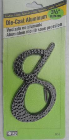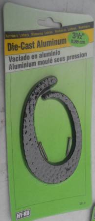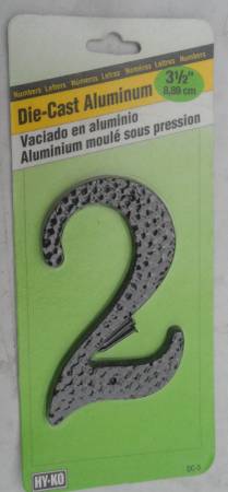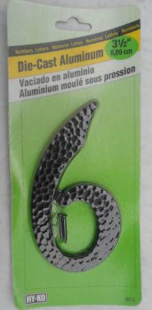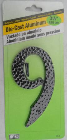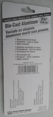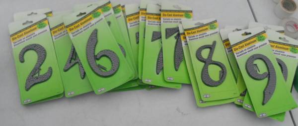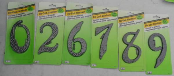 HOUSE NUMBERS: A selection of 3.5 inch/8.89 cm die-cast aluminum black hammer finish house numbers by HY-ko. Odd lots, nails included, and pre drilled holes for easy install. New Old Stock, still in original factory sealed packages. 3.5 inch numbers, new retail $4 each.