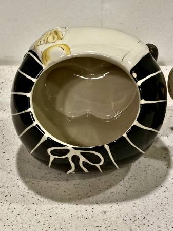 Deep. Great Color! Ceramic 2 Pcs The Bottom jar and the Top Lid has a Rubber gasket. Missing Original Packing inside.