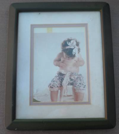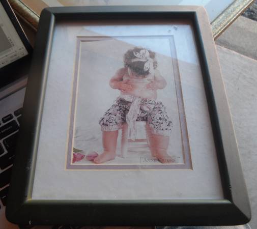 FRAMED PICTURE: A dark green/black wood framed matted picture of a young girl looking at her stomach. An Anne Geddes TM picture, known for her photos of babies. SIZE: 9.5 X 11 inch, picture 5x7 inch. In excellent condition.