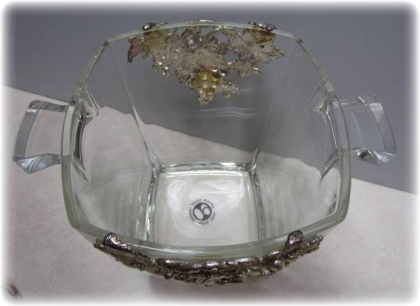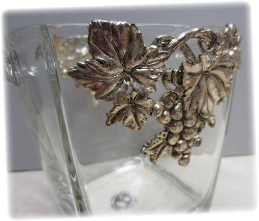 This is a beautiful clear glass ice bucket with grape leaf embellishments and tongs. It is from Arthur Court Designs of France. France is etched on the bottom. It stands 6" high by 5 1/4" wide at the top. Each handle extends out 1 1/4". It is in perfect condition.