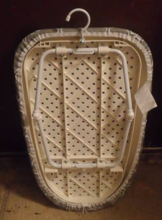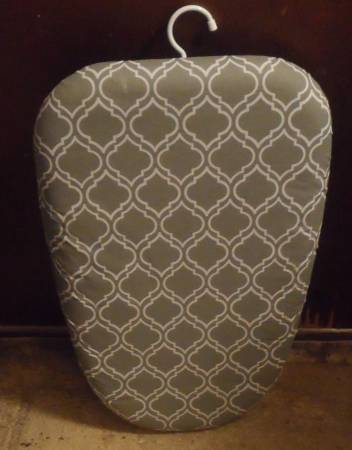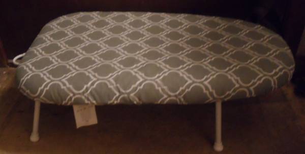 SMALL TABLE TOP IRONING BOARD: A small foldable lightweight ironing board perfect for the dorm room, apartment, cottage, or anywhere space that is at a premium. Also makes a good play item for younger kids. Has a hook that swivels out so it can be hung up. Size: Top 23 x 14 inches, Stands 8” high when legs open and 1.5” when legs folded. Removable gray and white cotton fabric cover with separate pad. An Amazon Basics product. Used, in like new condition.