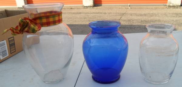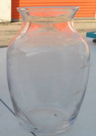 =Clear Glass: Size: Base 3.5”, 10” tall, widest point 6”. Opening 5” narrows to 3.5”.