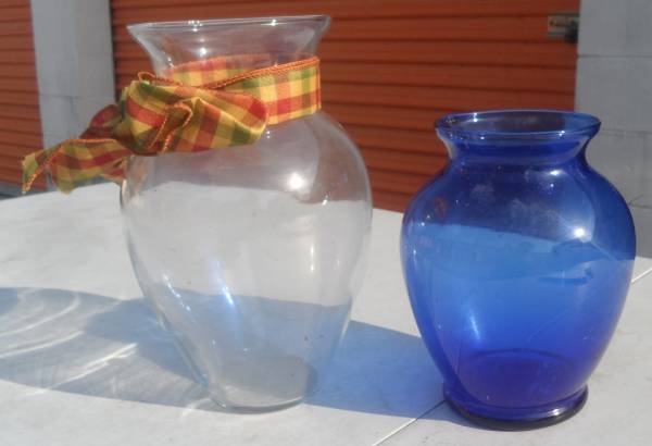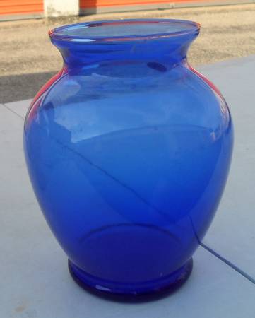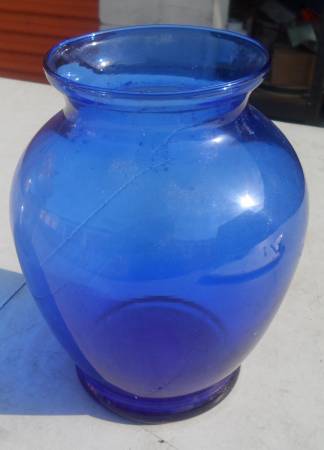 =Blue Glass: Size: Base 4”, 7.5” tall, widest point 6”. Opening 4” narrows to 3”.