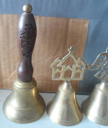 =Hand held “School Marm” bells. Bell 2.5” x 2”. Overall 6” w/ wooden handle. Harmony Manor engraved on wood handle. Have two. $2 each.