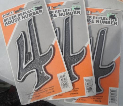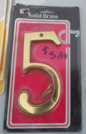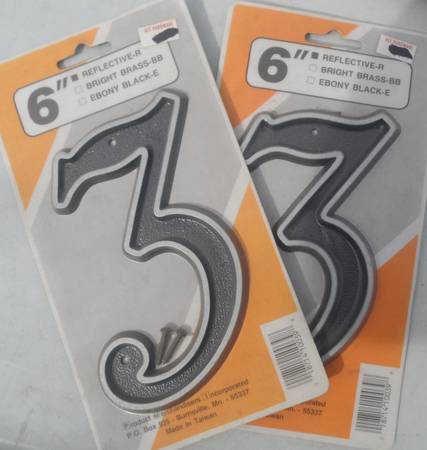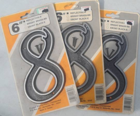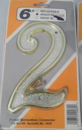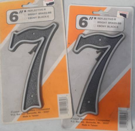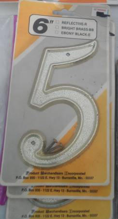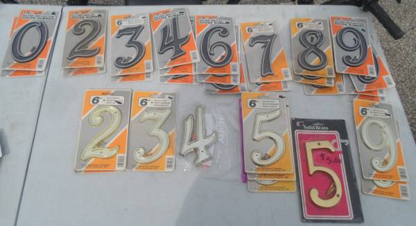 HOUSE NUMBERS: A selection of 6 inch house numbers. Odd lots. New Old Stock, still in original factory sealed packages. 6 inch numbers, new retail $4 each. 7” solid brass, new retail $9 each.