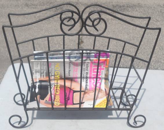 MAGAZINE HOLDER: A black metal holder for magazines, books, newspapers, and other items. Normally kept at side of arm chair/couch to keep items organized and in one spot. Size 19” wide, 17” tall, 6” depth.