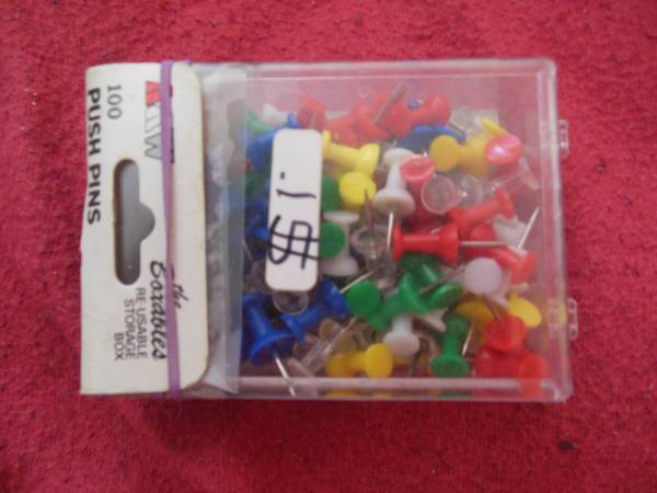 =Push Pins, box of 183 assorted colored push pins. $1.