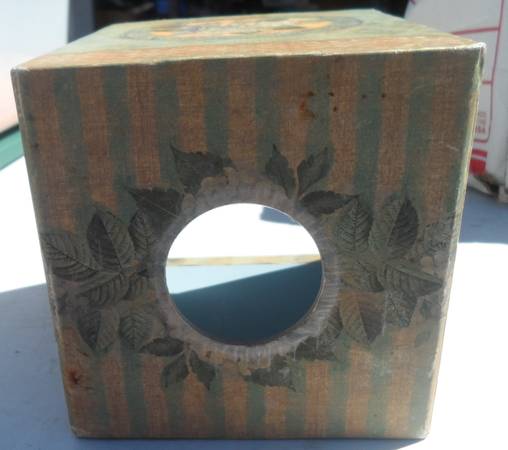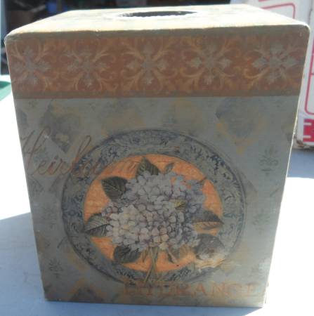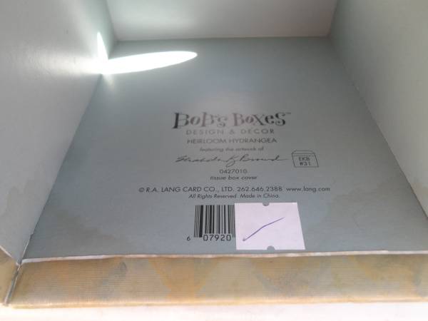 TISSUE BOX: A Bob's Boxes tissue box with art work by Shabeta K. Brourd (sp?) of a Hydrangea flower. Sold by R.H. Lang Card Company LTD. Works with standard 5x5x6 inch tissue boxes. Used, in good condition.
