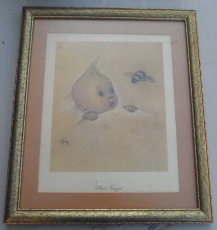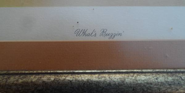 WHAT'S BUZZIN': A gold/black wood framed old style drawing of a child and a bee. SIZE: 12.5” x 14.5” overall. Matted format, Picture itself 9x10.5 inch. Wire hanger on back. From The House of Arssacra Herbert Dubler, Inc. 251 4th Ave, New York New York. Sold by Boehm's of Three Lakes, WI. Excellent condition.