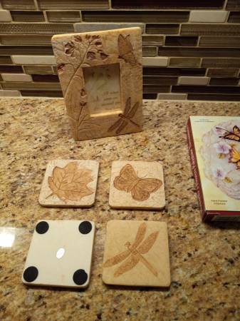 1. New Butterfly and Dragonfly Frame with Saying on it 'All nature wears one universal grin' and 4 Coasters that go with it. Asking $8.00 for the Set of 5.