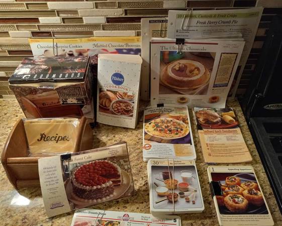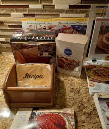 New/Never Used Pillsbury Cookbook (in middle of back row) and New Recipe Box; Other Recipe books/cards (Majority of these were never used and some are older but still perfectly fine).