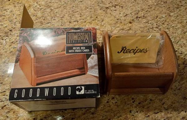 The Recipe Box is made of Wood and comes with Category Dividers for your recipes.