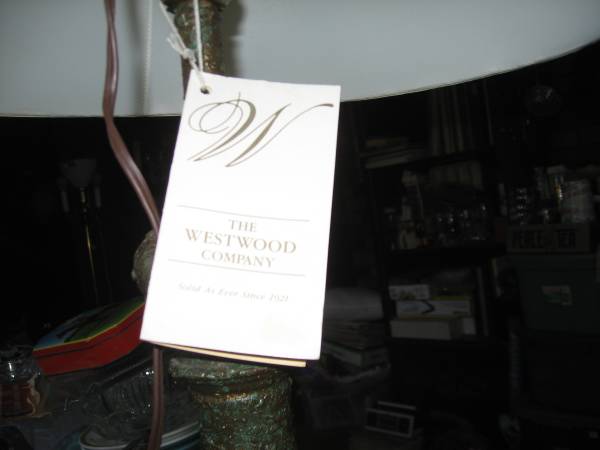 I have an older Westwood Company Table lamp for sale. The tag reads: 4468-677 Gold and Green Lamp. It is in nice condition. It is about 31 in tall. I am asking 75.00. Pick up at my home in Portage....