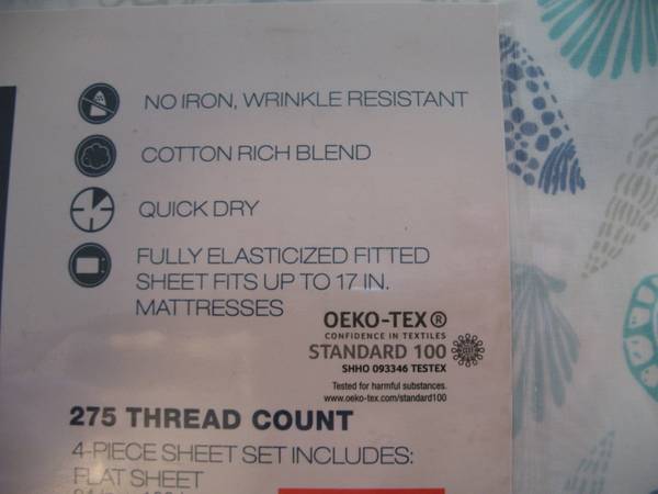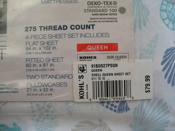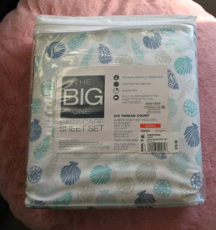 The Big One easy-care 4-piece queen sheets set with seashells pattern. Quick dry, no iron, wrinkle resistant cotton rich blend.