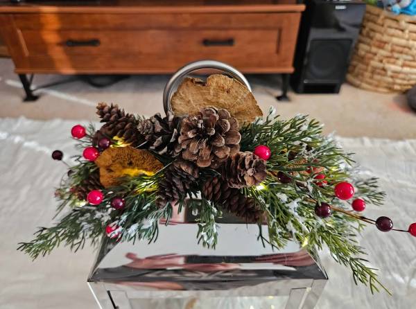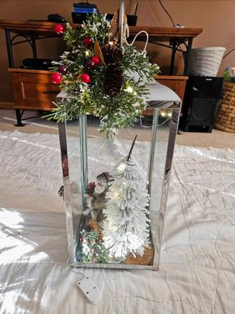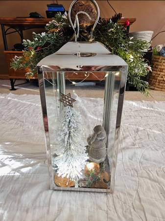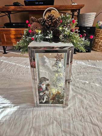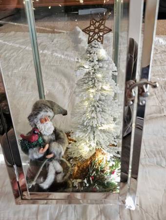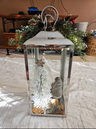 Gorgeous Christmas Lantern. Hand crafted and new. The lantern is a shiny chrome metal with a front door that latches shut. It has a loop handle at the top. There are two different set of white fairy lights that obviously light up. The lantern features a woodsy natural holiday theme with a gray robed santa, Christmas tree with lights and a wood star, pineconnes, berries, frosted pine sprigs and brown faux mushrooms. Quite beautiful and hard to capture in photos. It's 7x7x18-1/2 inches.