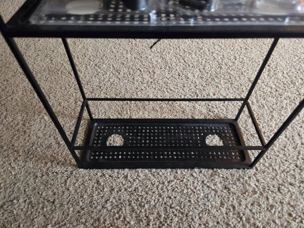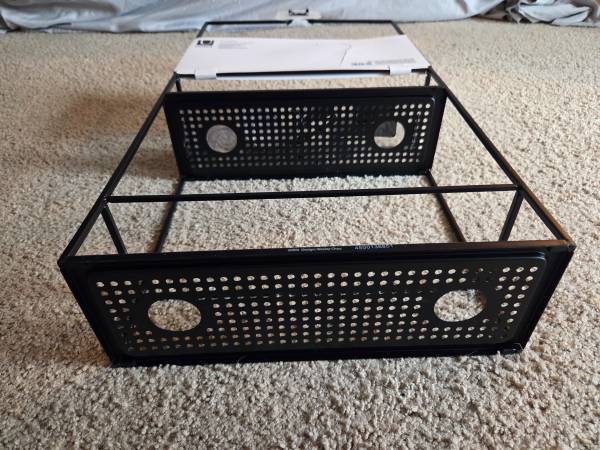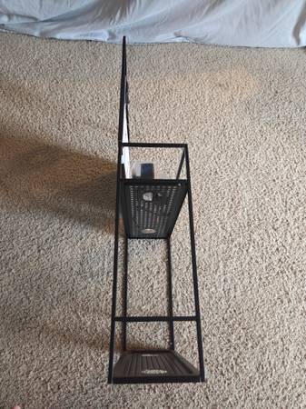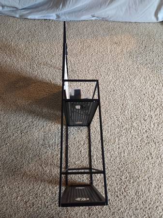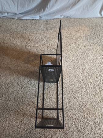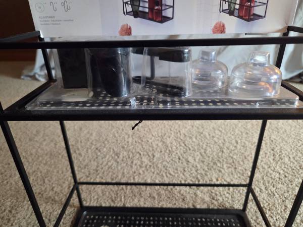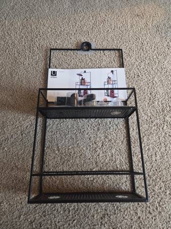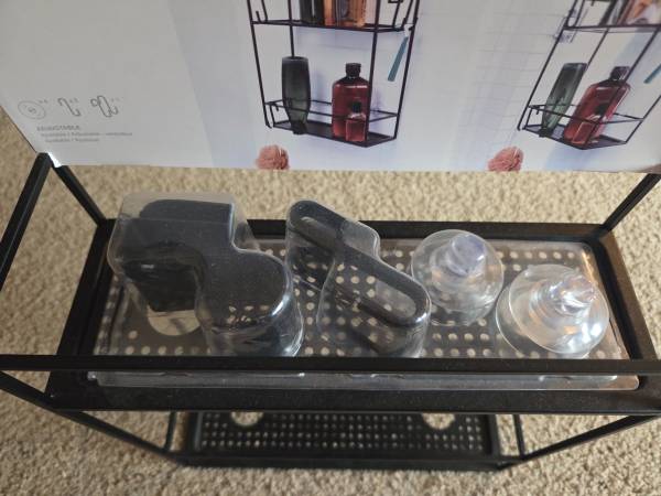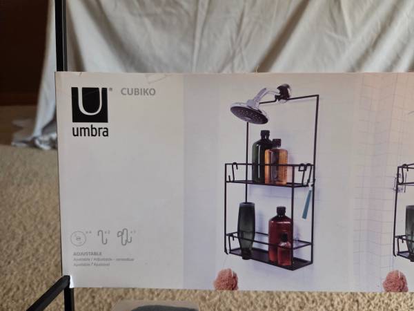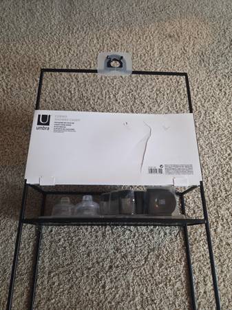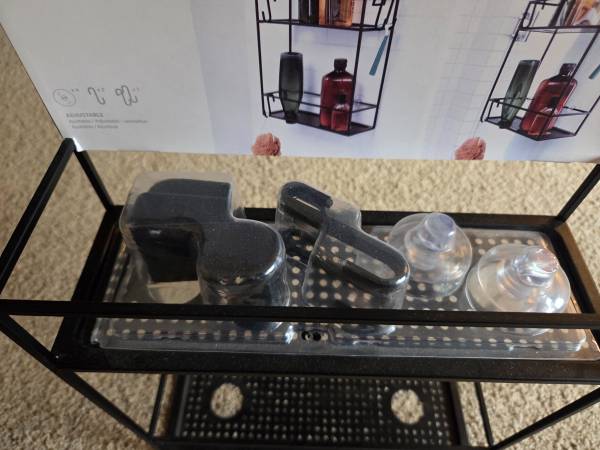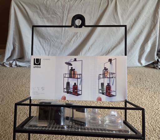 Never been, still in the original packaging, new. It's made of all metal and is sturdy, solid and a little heavier, durable. It's a metal frame with a black matte finish. It has 2 shelves ans comes with 4 S hooks, 4 suction cups and a black hanging bracket. This Caddy can be hung on a shower door, shower siding or on the shower head. Shelves have drainage holes. It's 23.75" tall x 12" Long x 4.5" wide.