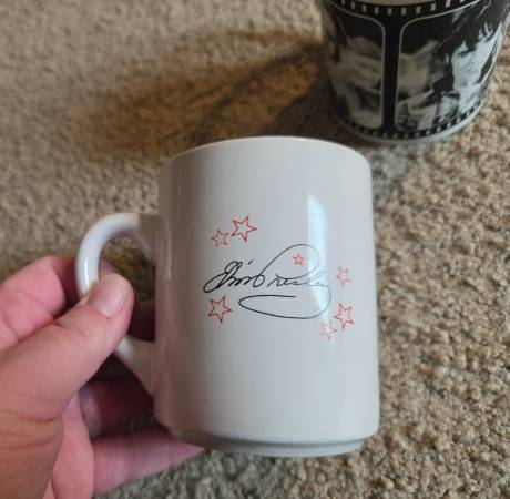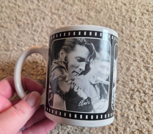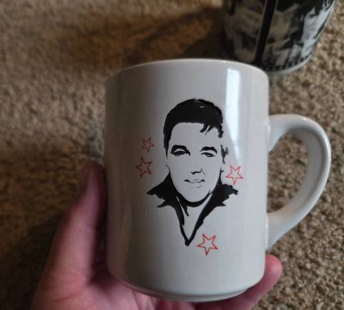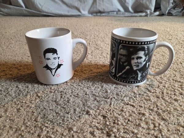 They are very gently used, displayed only, like new. No breaks, cracks or chips. 1 is a bright white mug with Elvis's face with 3 small red stars on one side and his signature in black with more small red stars on the other side. Tbe other is a black and white mug with 3 film like photos of Elvis. The mugs are about 4" tall x 3" round x 4" wide.