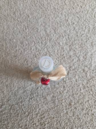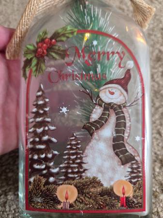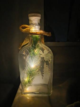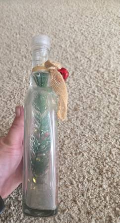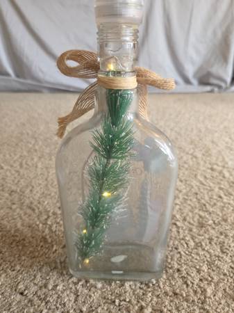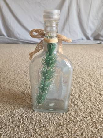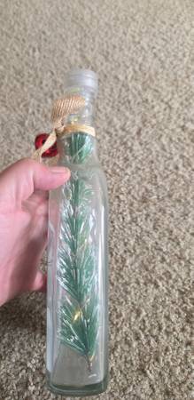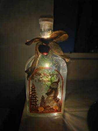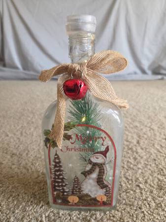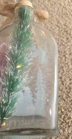 Gently used, displayed only, in excellent condition. It's a clear glass bottle with a pine tree sprig inside the bottle. The pine tree needles have flocked white tips with tiny white lights wrapped around it. The top twists to turn the lights on or off. It has a twine bow with a real red metal bell wrapped around the stem of the bottle. The bottle has a forrest scene with a snowman. It's a sticker. Above the forest scene is a remarry Christmas. It's 9.5" tall x 4" long x 1.5" wide.