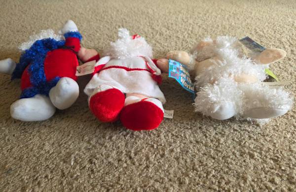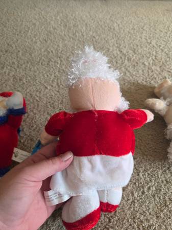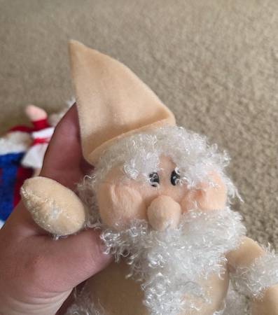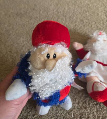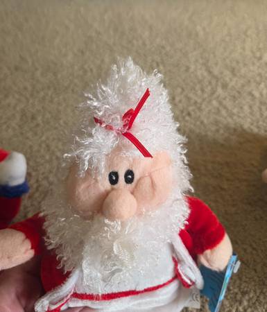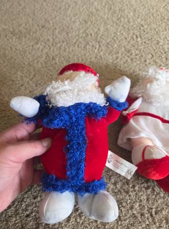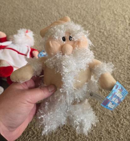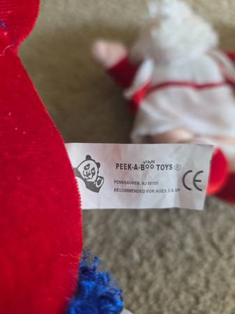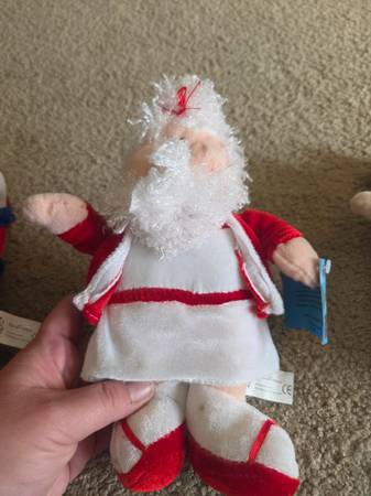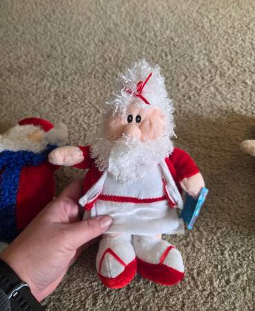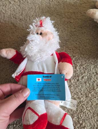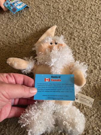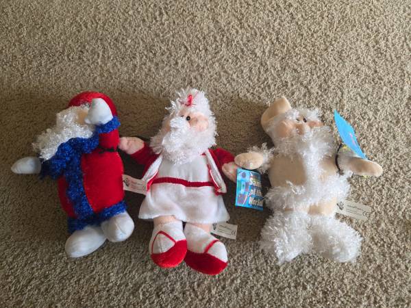 Gently used and in excellent condition. They are soft plush Santas with yarn like accents. These are Peek-A-Boo toys. 1 Santa is beige and white and it's the Santa od Canada. 1 is red and white, Santa of Japan. 1 red, white and blue Santa. The tag is missing but my guess is he's the Santa of Russia based on his hat. They are all about 10" tall x 7.5" long x 3.5" wide.