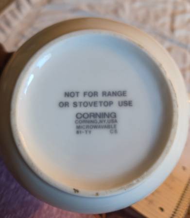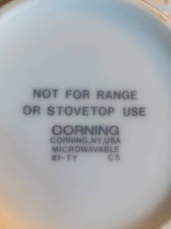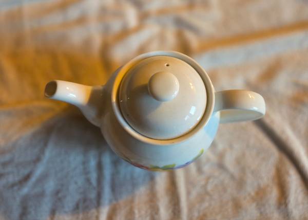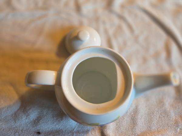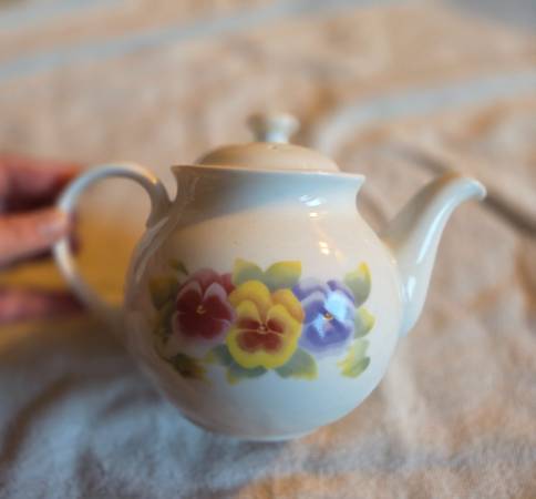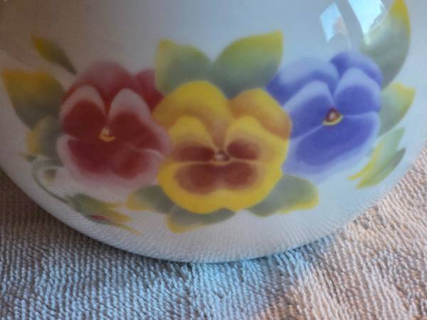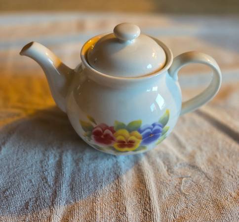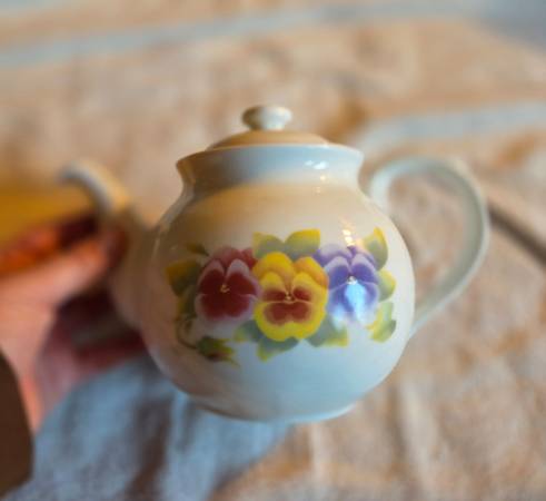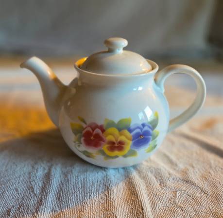 Very gently used, displayed only, like new. No chips, cracks, or breaks. The teapot is Corning Wear. It's a beautiful white teapot with red, yellow, and blueish purple pansies displayed on each side. I believe it's ceramic but I'm not 100 percent sure. This teapot is for display only, not for range or stovetop use. It's about 6" tall x 8.5" long x 5" wide.