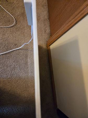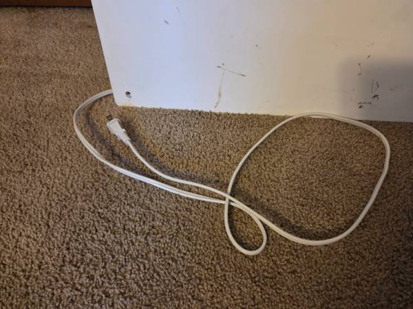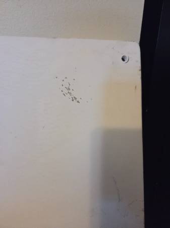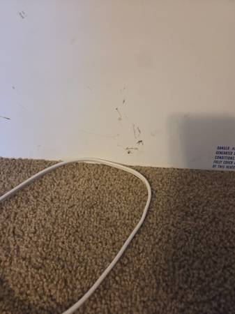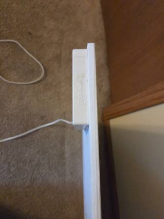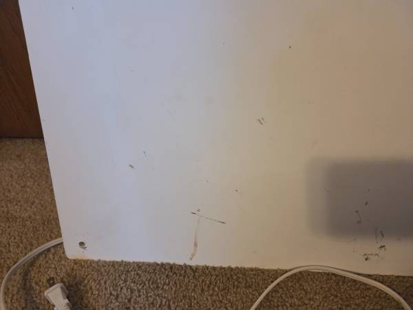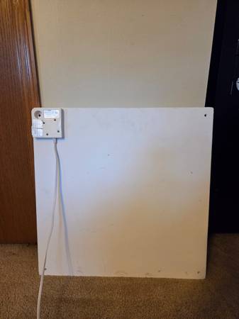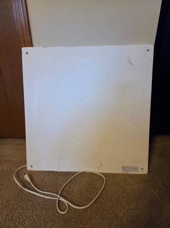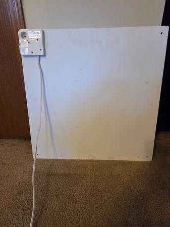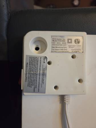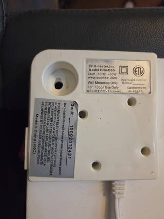 Used and in great condition. It has a bunch of marks on the front and the back but it works perfectly. It's sturdy, heavy and durable. It has 4 holes for hanging around the edges. This is a Eco-heater 120v, 80hz, 400 watts Electric plug-in heater. Model number NA400S; serial number 100920T2421. It has a long white cord and a red fip switch on the side of the electric box. It's about 23.75 x 23.75 x 1 inches.