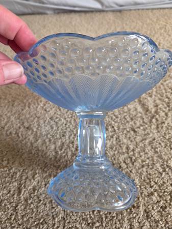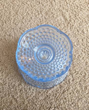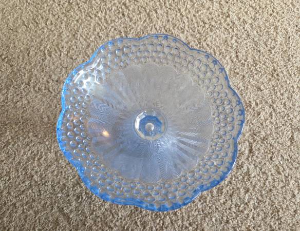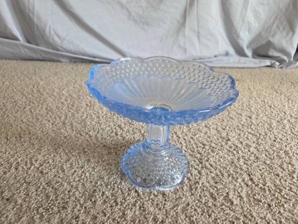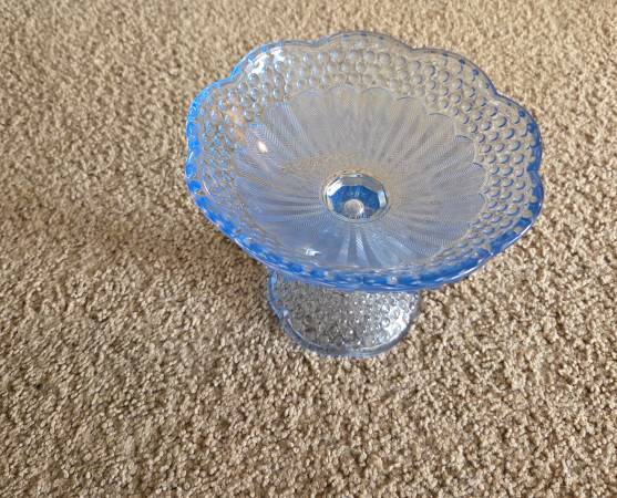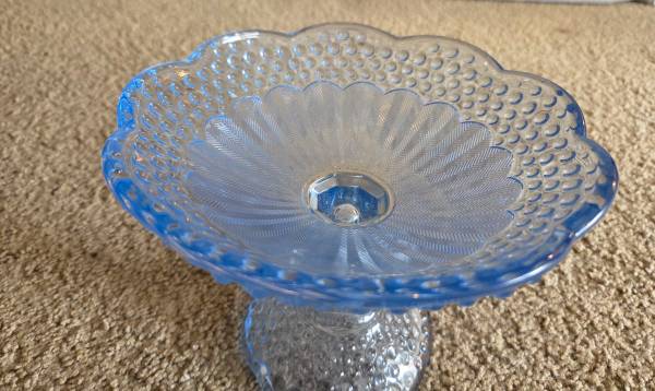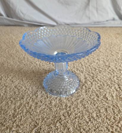 Gently used and in excellent condition, like new. This is a crystal pedestal dish with a gorgeous clear light color color. It has a dotted and feathered raised pattern. The top of the dishe has a raised sides and is smooth. It's 6" tall, the top diameter is 7.25" round and the bases diameter is 4.25" round. The dish is about 2" deep.