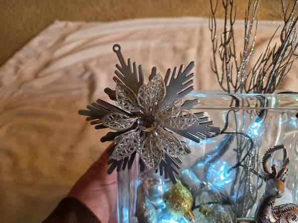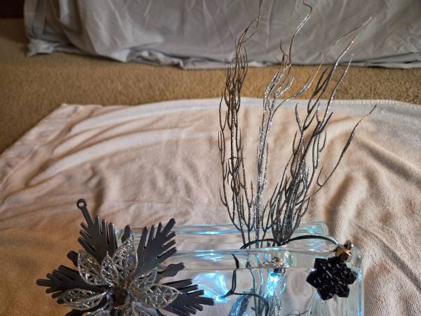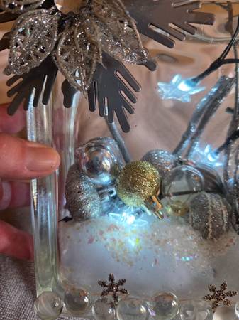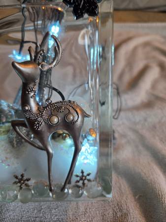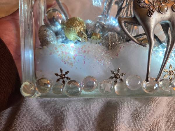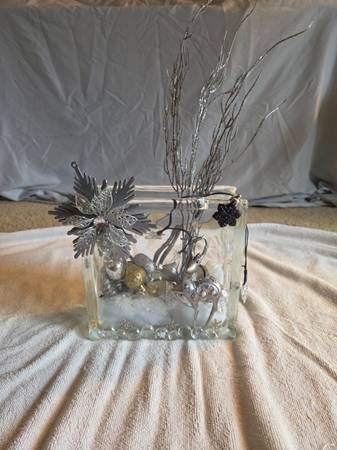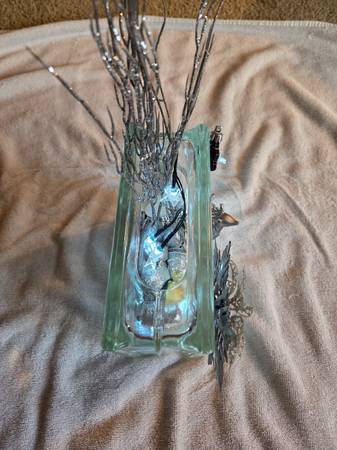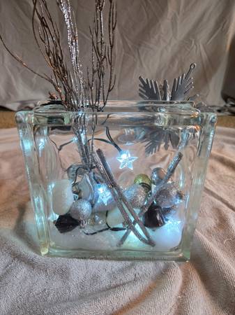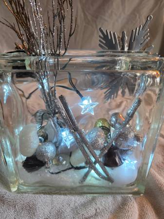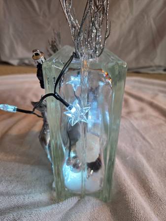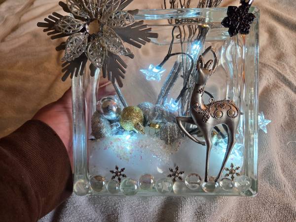 New, never used. This is a hand crafted holiday display. It's a beautiful glass brick with Holiday accents on the outside and the inside of the brick. It has bright white light up star string lights. Features faux snow, various shaped and colored ornaments. There is a beautiful silver reindeer ornament on the outside aswell as a silver sparkly gem snowflake. It's shiny, sparkly and very pretty. Features silvers, whites, golds and blacks. It also has sparkly silver branches. It's 17" tall with the sparkly branches, 9" long and 4" wide.